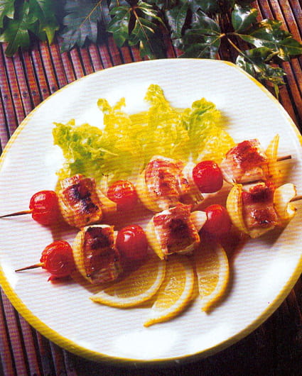 Former les brochettes en alternant des cubes de poisson, les tranches de lard et les tomates cerises. Faire cuire au four 15 minutes.